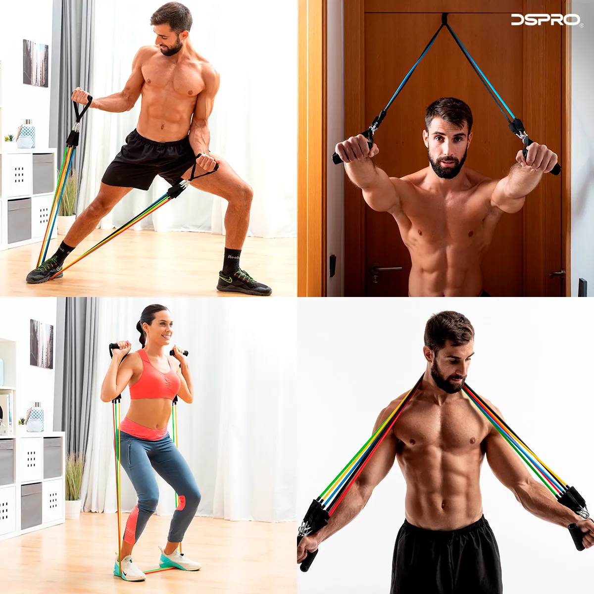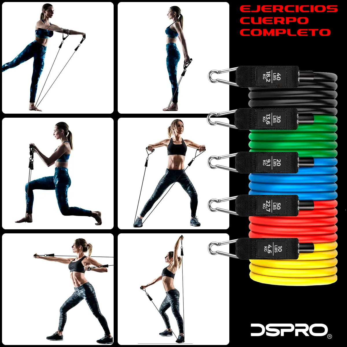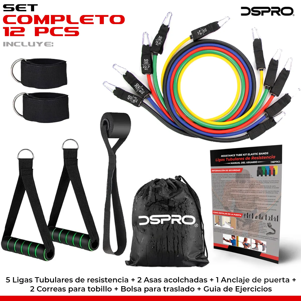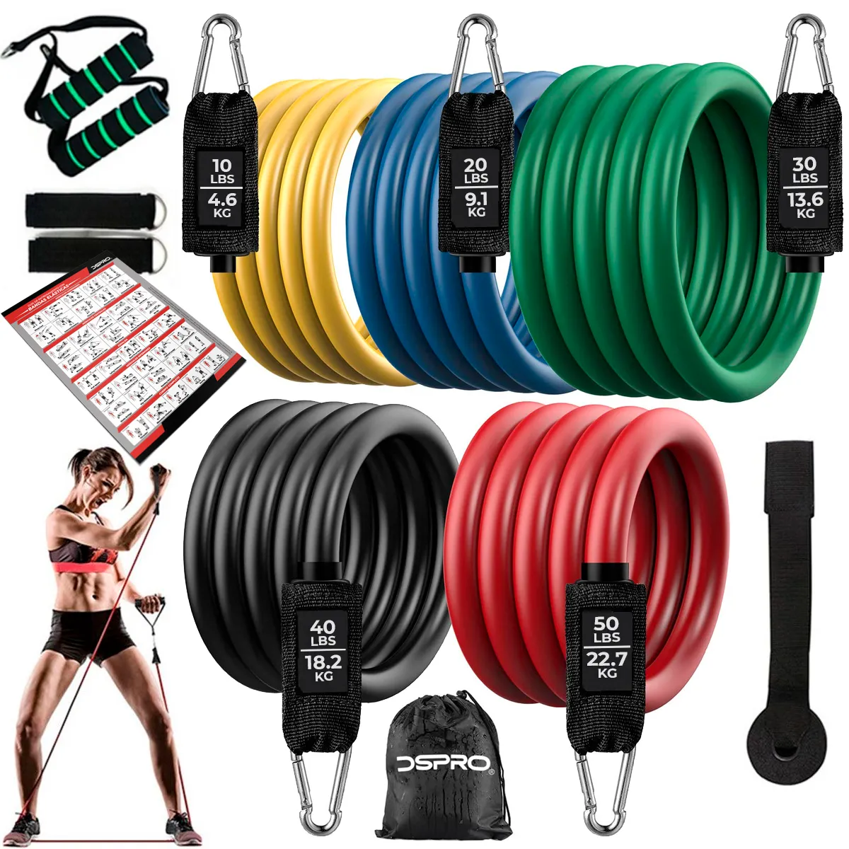 Ideales para cualquier Entrenamiento, Gym, Crossfit, Yoga, Pilates. Juego de 5 Ligas de resistencia ajustables de varios colores, con el nivel de resistencia incluido en cada banda, ademas de una guía de ejercicios, bolsa de transporte y accesorios para realizar multitud de ejercicios de brazos, hombros, pecho, glúteos, piernas, etc. Las bandas elásticas pueden utilizarse juntas o por separado, disponen de mangos de espuma y mosquetones de metal para un óptimo agarre y sujeción. Gracias a su diseño portátil y su bolsa de transporte, se puede utilizar fácilmente en cualquier parte.