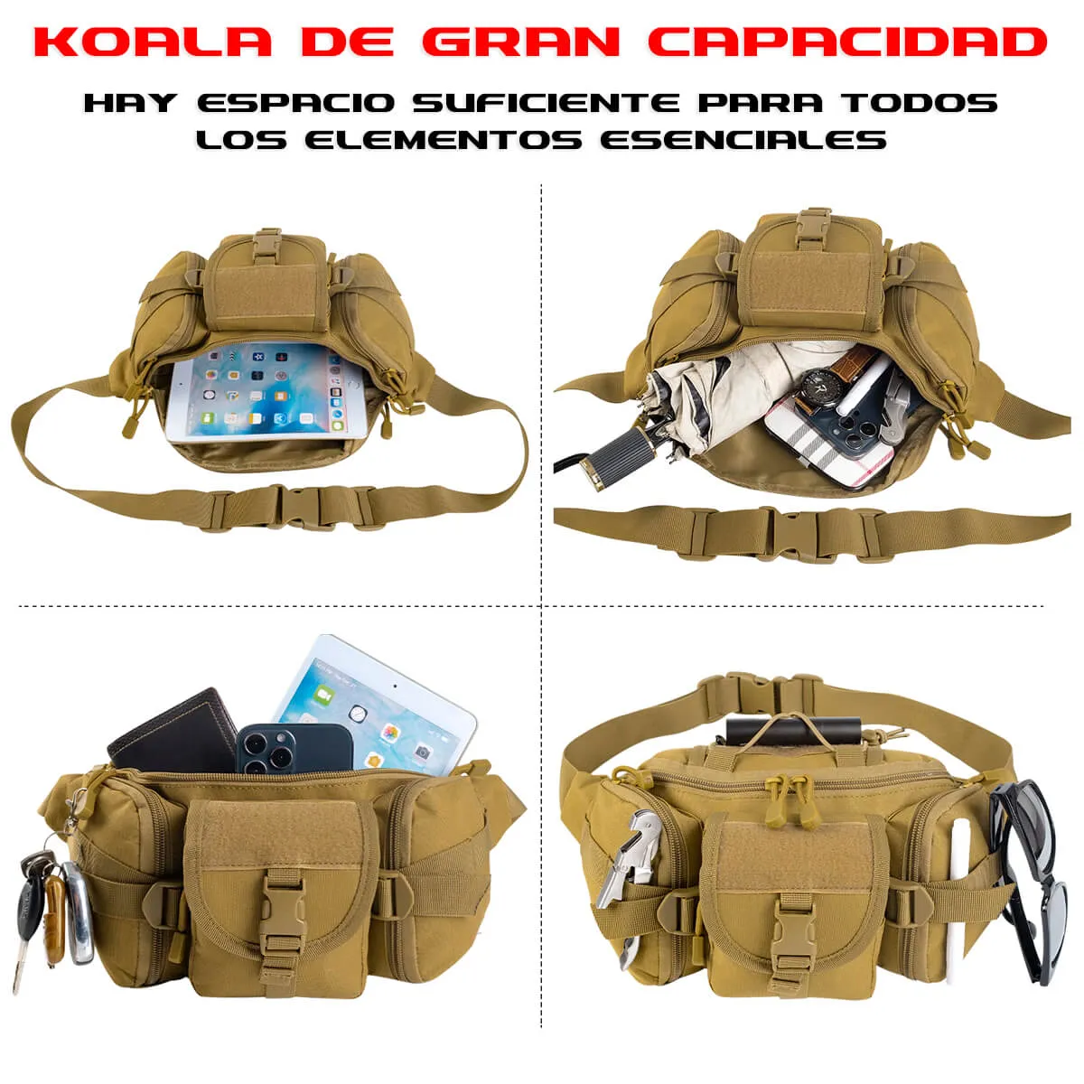 Obtén el compañero perfecto para tus aventuras: nuestro koala táctico con múltiples bolsillos y correa ajustable. Ideal para deportes, viajes y uso diario. Espacioso y versátil, diseñado para tu comodidad. ¡Lleva todo lo que necesitas contigo de manera cómoda y elegante! ¡Aprovecha ahora para disfrutar de tus actividades al aire libre al máximo!