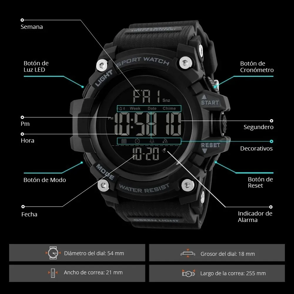 -> Cronómetro, Alarma, Luz LED, Doble Hora, Fecha, 12/24H